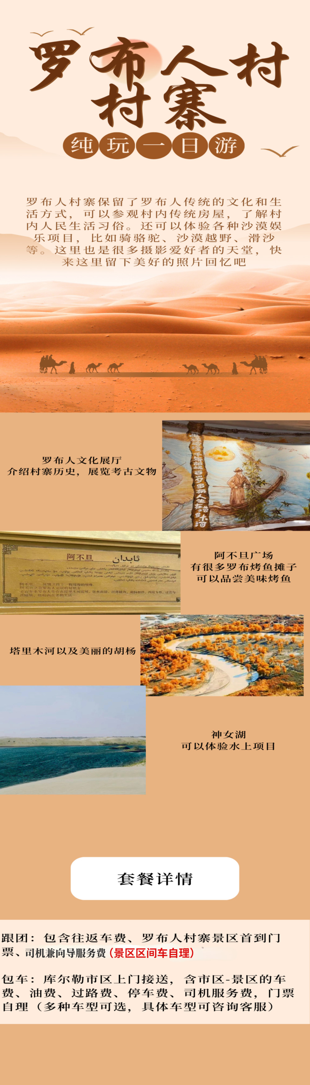 此次之旅即将结束,如果您玩儿的还不错的话,期待您把它推荐给更多的朋友哦~ 1.送站:司机师傅送您回库尔勒市区内(超出指定区域不提供送回 服务哦~),如遇人多的情况下,库尔勒市区定点散团哦 2.返回乌鲁木齐的朋友,请您自行订好返程的机票/车票哦~